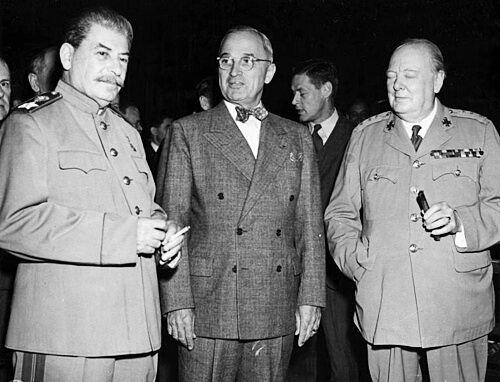 Потсдамская конференция, проходившая в пригороде Берлина (17 июля – 2 августа 1945 года), стала последней конференцией глав правительств СССР, США и Великобритании по вопросам прошедшей войны. Советскую делегацию возглавлял И.В. Сталин, Именно по предложению И. В. Сталина встречу было решено устроить в окрестностях Берлина. По его мнению, это было удобно и политически правильно.. Для заседаний был выбран полностью сохранившийся дворец Цецилиенхоф, бывшая резиденция кронпринца Вильгельма. Американскую делегацию возглавлял президент Г. Трумэн, английскую – премьер-министр Великобритании У. Черчилль, которого затем, после победы лейбористов на парламентских выборах, сменил К. Эттли. На конференции были согласованы основные принципы совместной политики в отношении Германии. Предусматривалось разоружение, демилитаризация, денацификация и демократизация страны.. Подчеркивалась необходимость ликвидации военных и полувоенных формирований, отмены нацистских законов. Конференция приняла решение военных преступников и тех, кто участвовал в планировании и осуществлении нацистских мероприятий, арестовать и предать суду. Все сухопутные, морские и воздушные вооружённые силы Германии, СС, СА, СД и гестапо со всеми их организациями, штабами и учреждениями, включая генеральный штаб, офицерский корпус, корпус резервистов, военные училища, организации ветеранов войны и все другие военные и полувоенные организации, вместе с их клубами и ассоциациями, служащими интересам поддержания военных традиций в Германии, решением конференции упразднялись. Верховную власть в Германии должны были осуществлять главнокомандующие вооружённых сил СССР, США, Великобритании и Франции, каждый в своей зоне.