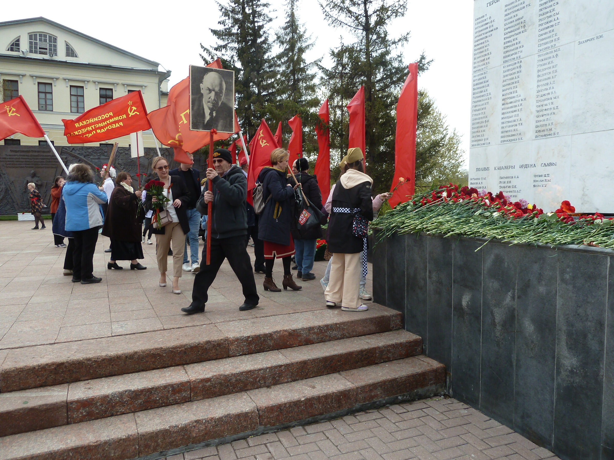 Еще больше народу оказалось на площади Прощания, где также находится Вечный Огонь. Люди возлагали цветы. Правда, сильно резало глаза наличие власовских флагов. Но тем не менее, радует что многие начинают понимать, что Победа в Великой Отечественной войне была одержана под Красным флагом. И новые Победы над фашизмом могут быть одержаны только под ним.
