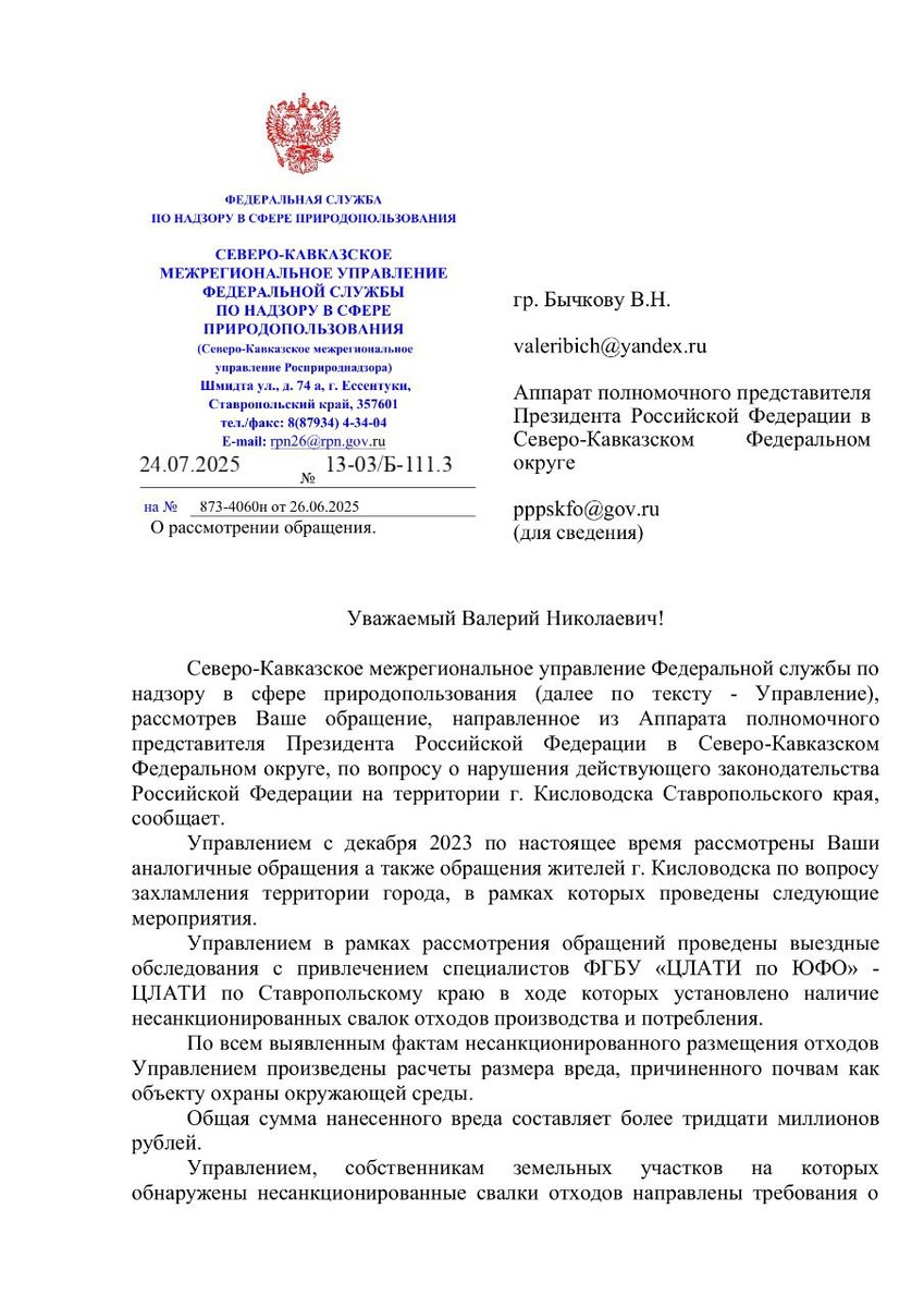 Ответ из Россельхознадзора. 19.12.2024 г. Подтверждает наличие свалок возле пос.Нежинский. Ждем проверок в конце января 2025 года. Ниже Прокуратура Предгорного района сообщает, что рекультивация свалок закончена, проводятся лабораторные исследования. Такой же примерно ответ прокуратура давала в ноябре 2024 года, что проводятся работы по рекультивации. После этого ответа Россельхознадзор провел свою проверку и ответ был такой, как выше, то есть, что свалка присыпана землей… Все эти ответы будут размещены здесь ниже.